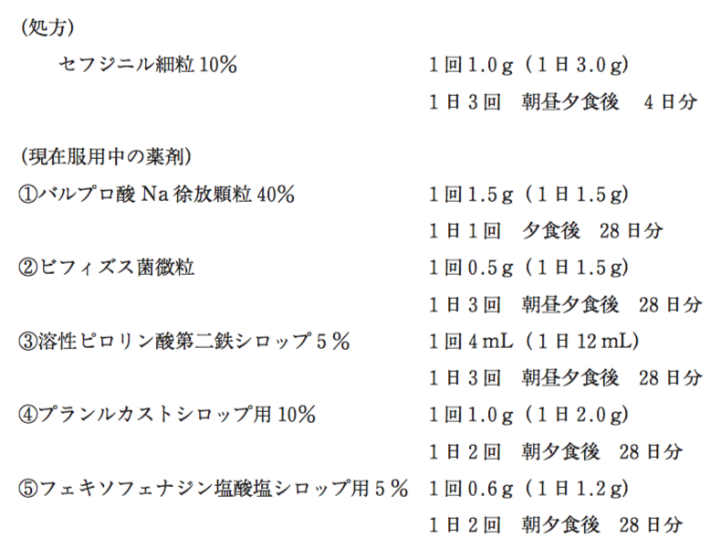 10歳女児。体重34 kg。昨夜より咽頭痛がひどかったため、母親が小児科を受診させ、以下の処方箋をかかりつけの保険薬局へ持参した。処方箋を受け取った薬剤師が薬剤服用歴とお薬手帳で現在服用中の薬剤を確認したところ、以下の①〜⑤であった。