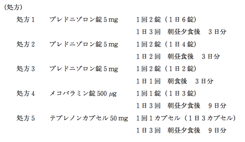 - プレドニゾロン錠は、朝食後6錠、昼食後4錠、夕食後2錠を3日間服用してください。