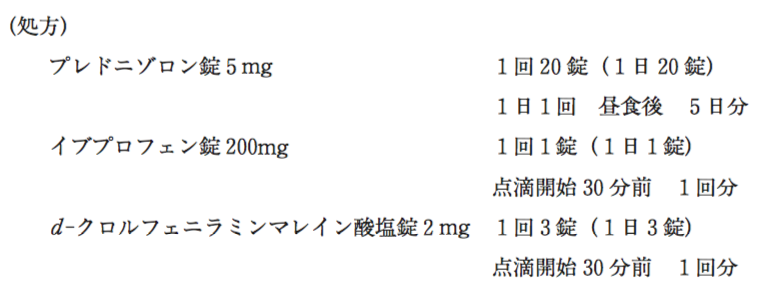 本療法に用いられるリツキシマブにより、インフュージョンリアクションが起こることがある。そのため、インフュージョンリアクションを回避することを目的として、解熱剤(イブプロフェン)と抗アレルギー薬(d−クロルフェニラミンマレイン酸塩)が処方されていることを説明する。