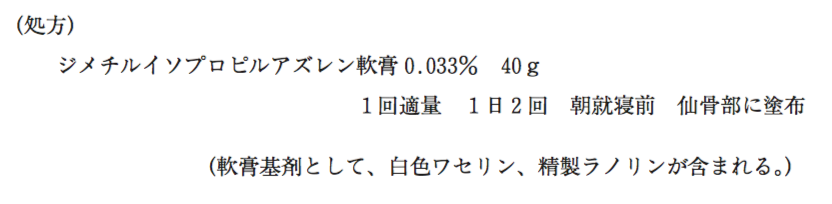 - 本剤3 g中にジメチルイソプロピルアズレンが10 mg配合されている。