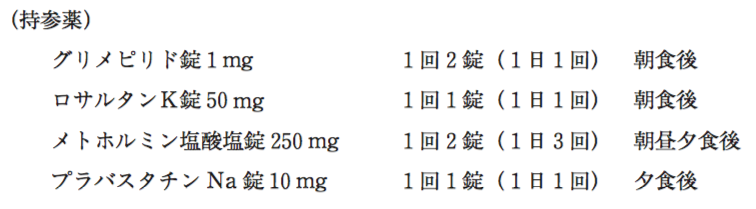 64歳男性。BMI 28.5。糖尿病で近医に通院中であった。全身倦怠感を訴え、浮腫も認められたため精査目的で入院となった。入院時の持参薬と検査データは以下の通りである。