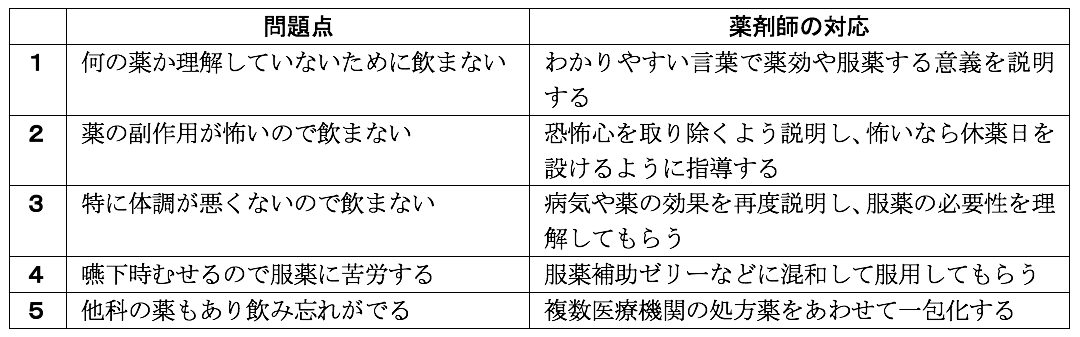 薬剤師は、この男性の服薬アドヒアランス低下に関わる問題点を確認した。それに対する薬剤師の対応のうち、誤っているのはどれか。1つ選べ。