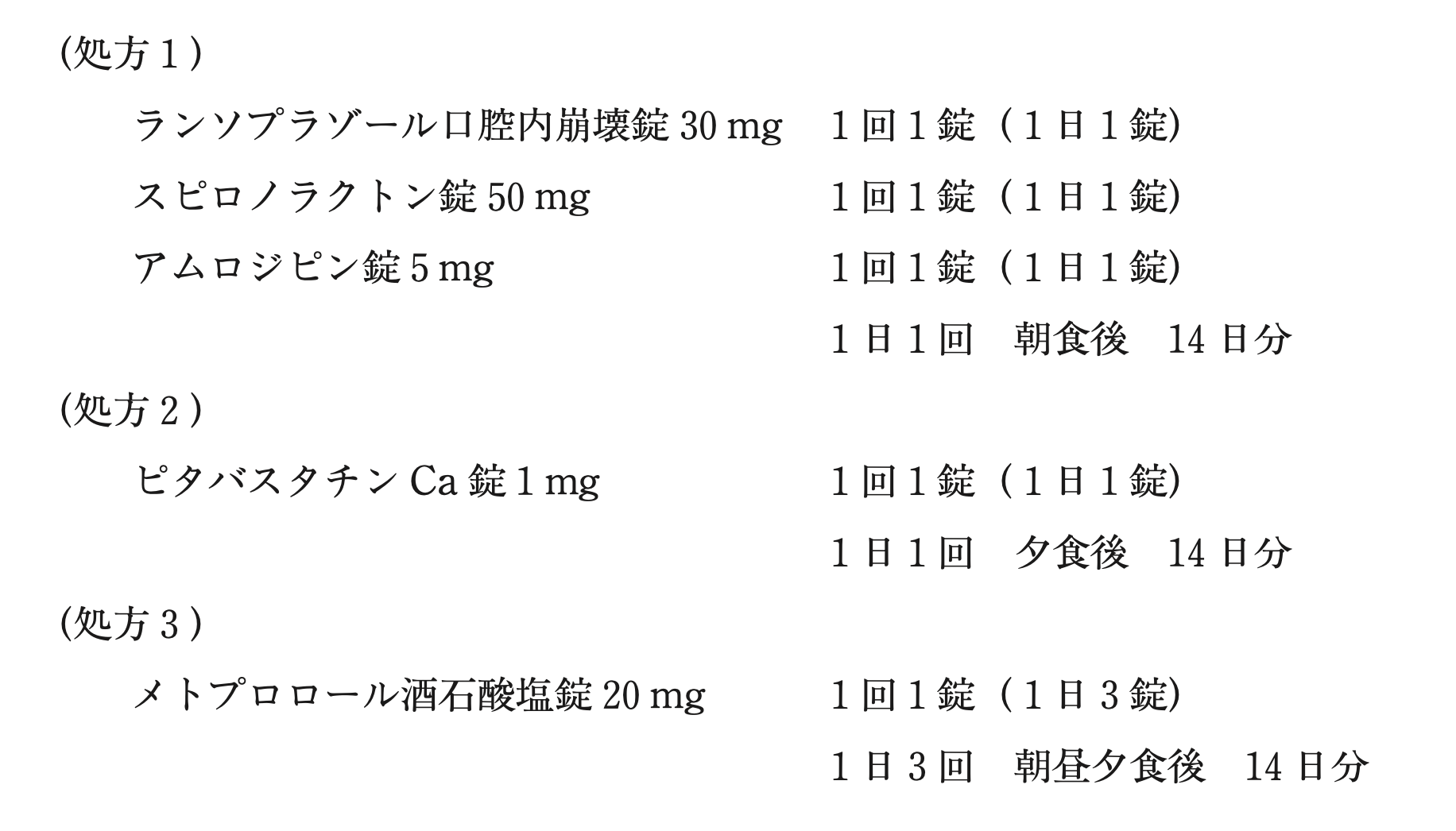 72歳男性。薬局に以下の処方箋を持参した。検査値を見せてもらうと血清カリウム値が基準値の上限を超えていた。