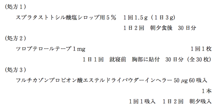 8歳男児。ぜん息でかかりつけ医に以下の処方を出してもらっている。