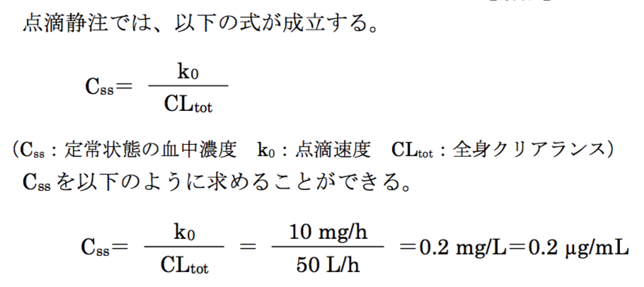 第101回薬剤師国家試験 問46 点滴静注 2025 1/23 第101回薬剤師国家試験 全身クリアランスが50 L/hである薬物を10 mg/hの速度で点滴静注した場合の定常状態における血中濃度(µg/mL)に最も近い値はどれか。1つ選べ。 0.2 0.5 2 5 50 解答・解説 解答 1 解説 第101回薬剤師国家試験 よかったらシェアしてね! URLをコピーしました! 第101回薬剤師国家試験 問45 薬物動態パラーメータ 第101回薬剤師国家試験 問47 治療薬物モニタリング(TDM) 関連記事 第101回薬剤師国家試験 問345 輸液の計算 2017年8月2日 第101回薬剤師国家試験 問344(実践問題) アトピー性皮膚炎 2017年8月2日 第101回薬剤師国家試験 問343(実践問題) 一般用医薬品 2017年8月2日 第101回薬剤師国家試験 問342 副作用 2017年8月2日 第101回薬剤師国家試験 問341 2017年8月2日 第101回薬剤師国家試験 問340 医薬品情報 2017年8月2日 第101回薬剤師国家試験 問339 病院における医薬品採用 2017年8月2日 第101回薬剤師国家試験 問338 手足症候群への対処法 2017年8月2日 コメント コメント一覧 (1件) […] 第101回 問46 […] 返信 コメントする コメントをキャンセルコメント ※ 名前 メール サイト