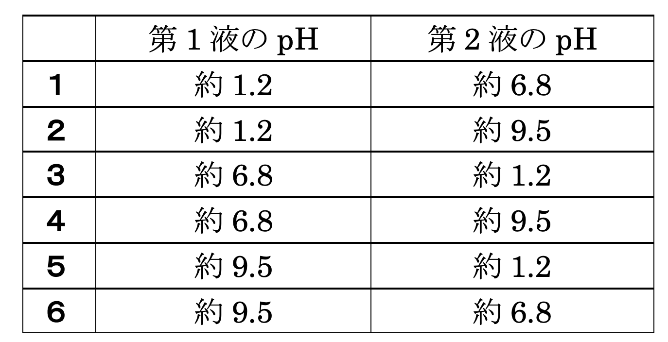 日本薬局方において、腸溶性製剤の崩壊試験に用いられる崩壊試験第1液と崩壊試験第2液のpHの組合せとして、正しいのはどれか。1つ選べ。