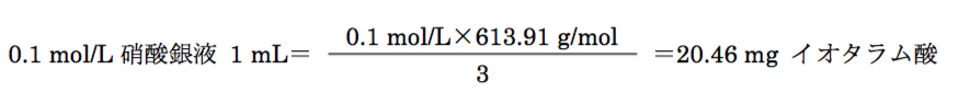 イオタラム酸からは3 molのI-が遊離し、遊離したI-と硝酸銀は1:1で反応するため、イオタラム酸1 molに対して硝酸銀3 molが反応する(対応数:3)。