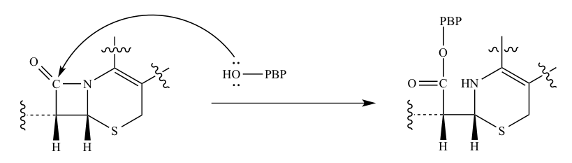 - 細菌中のペプチドグルカン合成酵素との間で、β−ラクタム環の開環を伴って共有結合を形成することにより、細胞壁の生合成を阻害する。