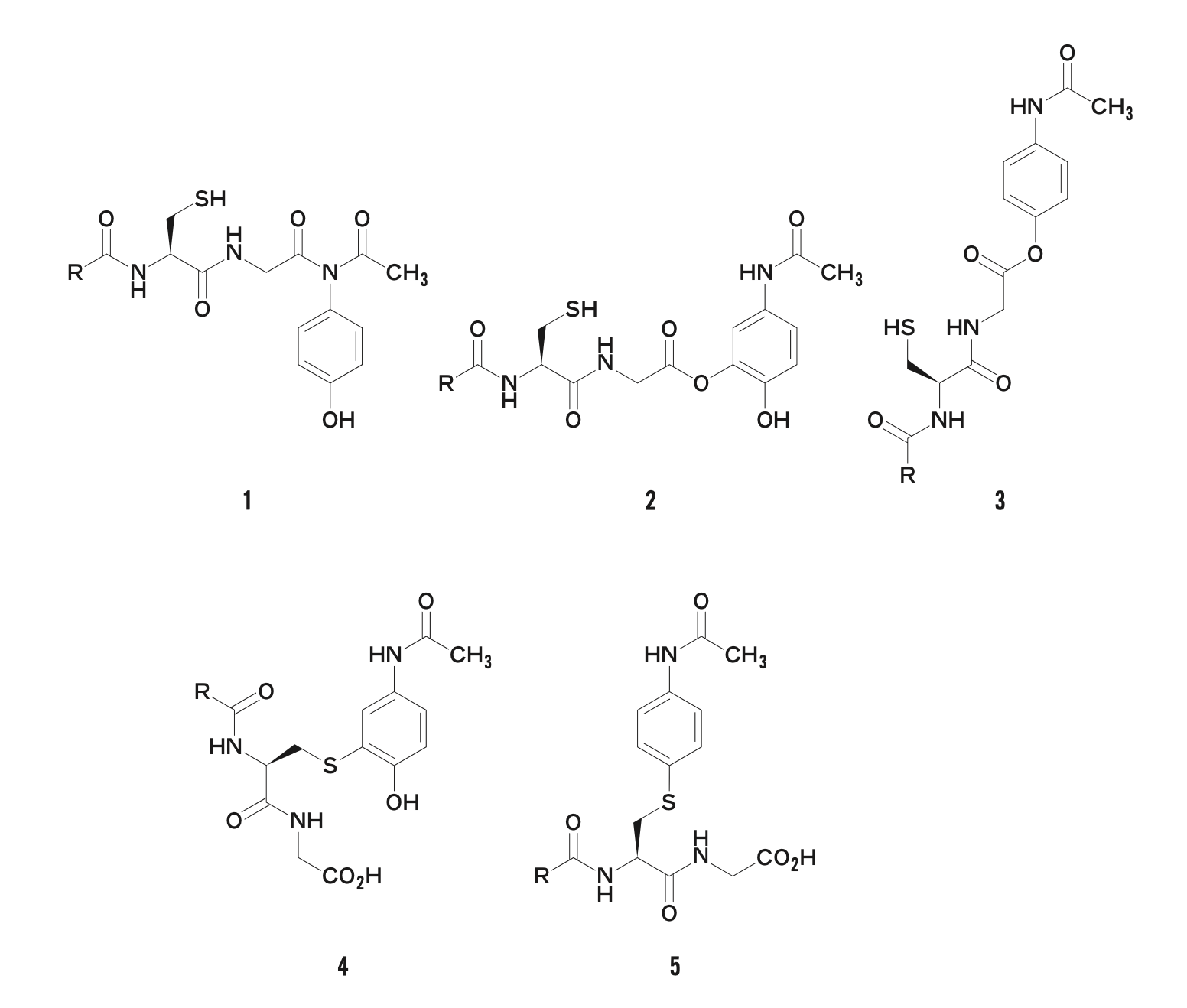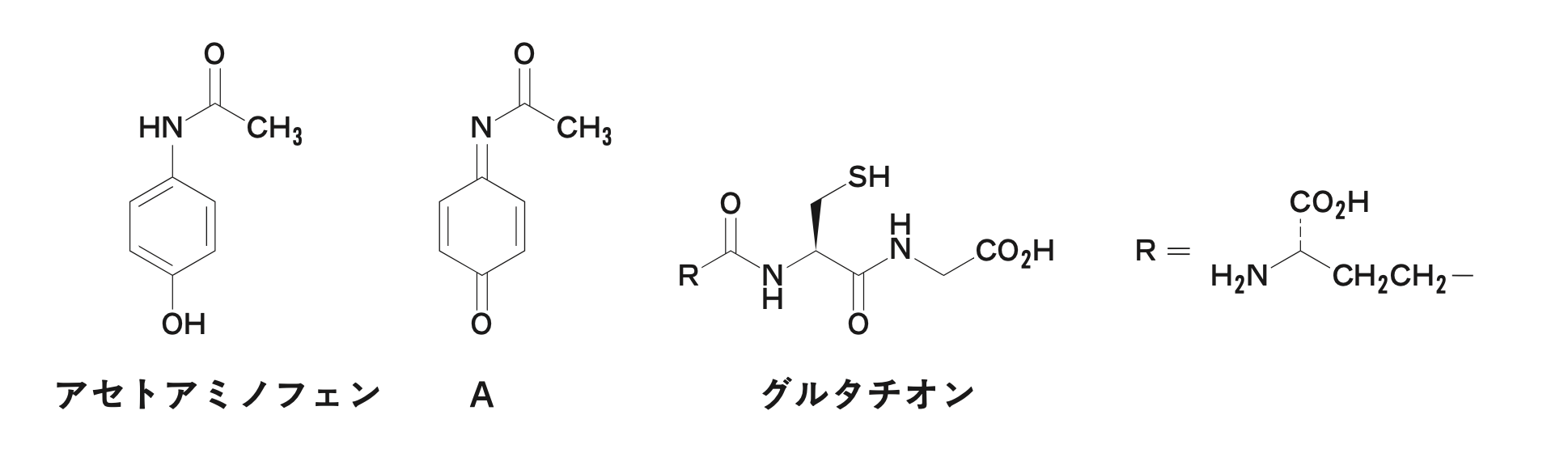 アセトアミノフェンが大量投与された際に生じる代謝物Aは、グルタチオンとの間で付加体を生じる。この付加体の構造式として最も適切なのはどれか。1つ選べ。