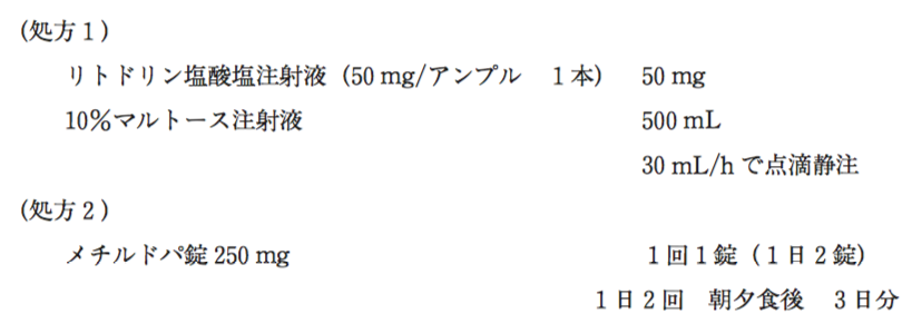 メチルドパ(処方2)は、脳内でα−メチルノルアドレナリンに代謝され、中枢性のアドレナリンα2受容体を刺激し、末梢交換神経活性を低下させる。また、α−メチルノルアドレナリンは、アドレナリン作動性神経内のノルアドレナリンの貯蔵部位に入り、ノルアドレナリンの遊離を抑制することにより、交感神経活性を低下させる。