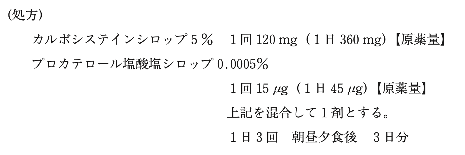 2歳3ヶ月女児。体重12 kg。湿性咳嗽に対して以下の処方箋が発行され、母親が薬局に持参した。当該薬局の調剤内規では「1回の服用量が整数値となるように精製水を最小量加える」となっている。