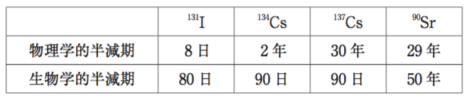表は、放射性物質131I、134Cs、137Cs及び90Srの物理学的半減期並びに成人における生物学的半減期を示している。これらの放射性物質に関する記述のうち、正しいのはどれか。2つ選べ。