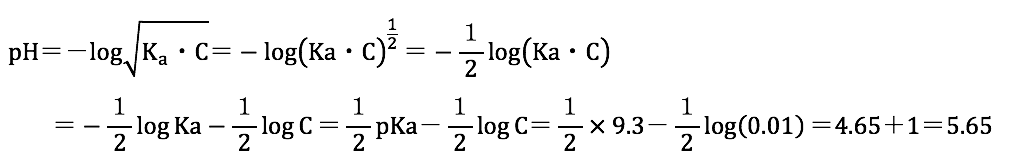 アンモニウムイオンのpKa=9.3である(弱酸である)ことから、アンモニウムイオンから発生する[H+]は以下の式より求めることができる。