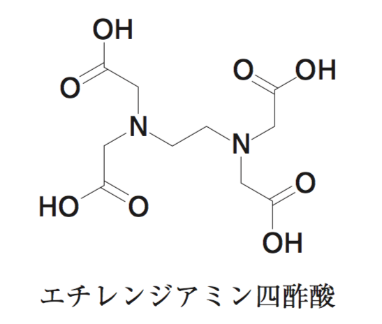 EDTAは、分子内に4個のカルボキシ基と2個の窒素原子を配位原子にもつ六座配位子であり、金属イオンと1:1で結合し、安定なキレートを形成する。