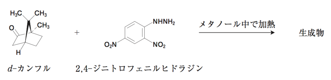 本反応は、d−カンフルが有するカルボニル基に2,4−ジニトロフェニルヒドラジンが縮合して、2,4−ジニトロフェニルヒドラゾンが生成する反応である。