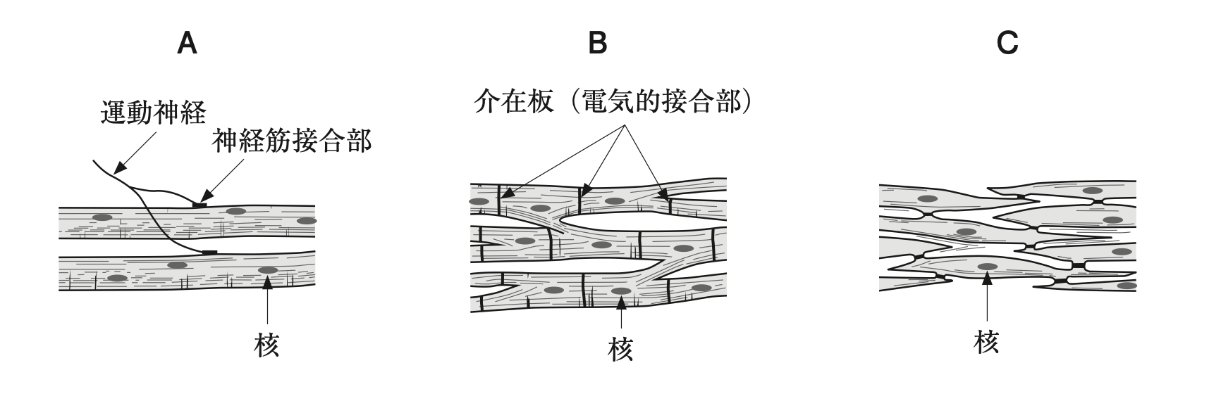 - Aは横紋筋であり、B及びCは平滑筋である。