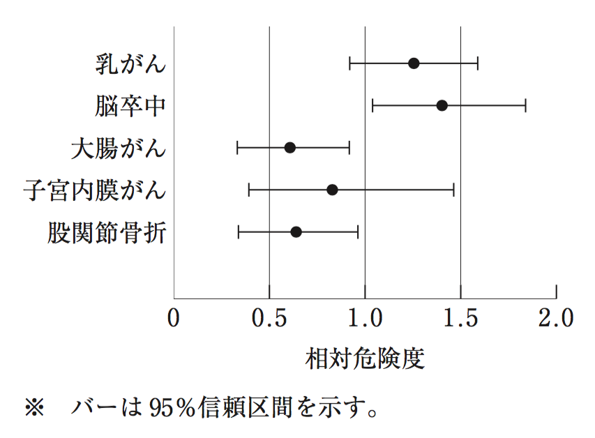 設問の図より、乳がん、子宮内膜がんの相対危険度の95%信頼区間は1を挟んでいるので、その結果は有意でないと考えられる。脳卒中の相対危険度は1より大きく、その95%信頼区間は1を挟んでいないため、投与群で脳卒中の発症のリスクが増加していると考えられる。また、大腸がん、股関節骨折の相対危険度は1より小さく、その95%信頼区間は1を挟んでいないため、投与群で大腸がん、股関節骨折の発症のリスクが減少していると考えられる。