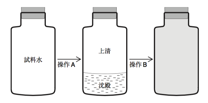 【操作A】試料水で充満させた測定瓶にMnSO4溶液1mL及びアルカリ性ヨウ化カリウム(KI)・アジ化ナトリウム溶液1mLを加え、栓をした後、転倒混和し、静置する。