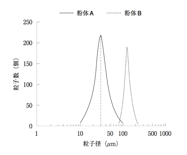 設問中の個数基準の粒度分布曲線より粉体Aのモード径(最頻値)は30 µmであり、粉体Bのモード径(最頻値)よりも小さいと判断することができる。このことから、粉体Aは粉体Bに比べ粒子径が小さい粉体で構成されていると考えられる。