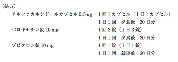 78歳女性。体重45 kg。骨粗しょう症、うつ病及び不眠症のため下記の処方薬を服用していた。最近、食欲がなくなり、とても体がだるいとの訴えを聞いた家族が、この女性を通院中の病院に連れて来たところ、そのまま入院となった。