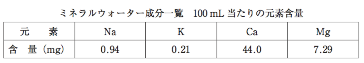ミネラルウォーターには、100 mL中にCa:44.0 mg、Mg:7.29 mgが含まれていることから、それぞれの濃度(mg/L)は、440 mg/L、72.9 mg/Lとなり、また、それぞれのモル濃度は、11 mmol/L(440 mg/L÷40.0)、3 mmol/L(72.9 mg/L÷24.3)となる。