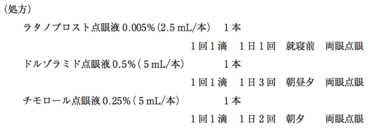 77歳女性。下記の眼科の処方箋を薬局で応需した。持参したお薬手帳には、他院で処方され現在服用中の内容が記載されていた。さらに患者にどんな病気で薬を服用しているのかインタビューをしたところ、処方医への問合せが必要になった。