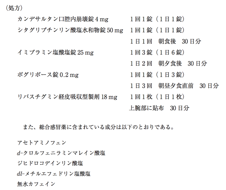 この患者が常用している処方薬の中で、この総合感冒薬と併用すると排尿障害が増悪する可能性の高い薬剤はどれか。1つ選べ。