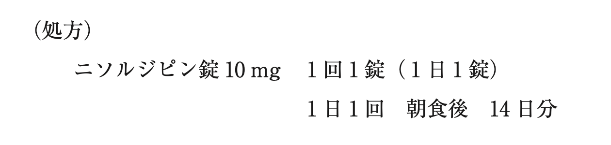 - 明日からは、ニソルジピンの服用は中止するように指導した。