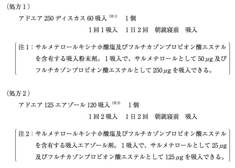 処方1は吸入粉末剤であり噴霧剤を使用せず、吸気によりエアゾールを発生させるため、タイミングを気にせず吸入することができる。それに対して処方2は噴霧剤とともに有効成分を噴霧するため、噴霧するタイミングと吸入するタイミングを合わせる必要がある。これらのことから、処方1ではスペーサー(吸入補助具)を使用することはないが、処方2では噴霧と吸気のタイミングが合わないときにはスペーサーを使用することがある。