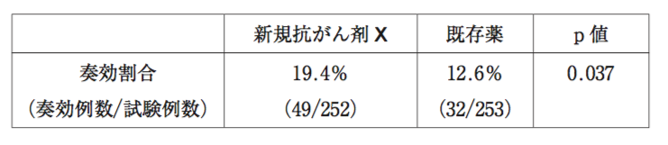 この薬剤師は、前問の資料から、転移性乳癌患者を対象として新規抗がん剤Xと既存薬の奏効割合を比較した下表の結果を得た。この解析に用いられた統計手法 として適切なのはどれか。1つ選べ。