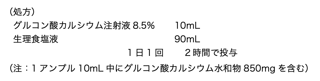 本設問では、グルコン酸カルシウム注射液8.5% 1アンプル(10 mL)に生理食塩液を90 mL添加し、輸液を調製しているため、輸液の容積は100 mLとなる。このことから、処方に基づいて調製された輸液のカルシウム濃度(mEq/mL)は3.8 mEq÷100 mL=0.038 mEq/mLとなる。