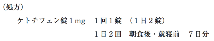 本患者には、1回1 mg(1回1錠×1mg/錠)、全量14 mg(全量14錠×1mg/錠)のケトチフェンが処方されている。ケトチフェンシロップ0.02%には、1 mL中にケトチフェンが0.2 mg含まれていることから、錠剤をシロップに変更すると1回5 mL(1mg÷0.2 mg/mL)、全量70 mL(14 mg÷0.2 mg/mL)のシロップが必要となる。