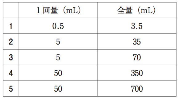 母親に確認したところ、錠剤を服用できないことがわかり、処方医に疑義照会を行い、ケトチフェンシロップ0.02%への処方変更を提案した。シロップ剤の1回量及び全量として正しいのはどれか。1つ選べ。
