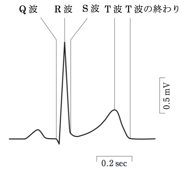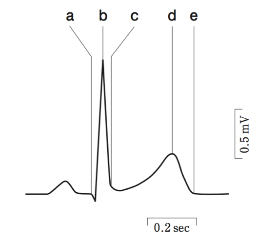 第104回薬剤師国家試験 問58(必須問題) 心電図 2025 1/20 第104回薬剤師国家試験 第II誘導により得られた心電図(下図)において、QT間隔に当たるのはどれか。1つ選べ。 1 a〜d間 2 a〜e間 3 b〜d間 4 b〜e間 5 c〜d間 解答・解説 解答 2 解説 QT間隔とは、QRS波の始まりからT波の終わりまでの間隔のことである(下図参照)。 第104回薬剤師国家試験 よかったらシェアしてね! URLをコピーしました! 第104回薬剤師国家試験 問57(必須問題) 肝硬変 第104回薬剤師国家試験 問59(必須問題) 食道がん 関連記事 第104回薬剤師国家試験 問344 ICUにおける医薬品の使用 2024年2月9日 第104回薬剤師国家試験 問290〜291 2019年11月25日 第104回薬剤師国家試験 問288〜289 2019年11月25日 第104回薬剤師国家試験 問286〜287(実践問題) 過去問解説 2019年11月25日 第104回薬剤師国家試験 問284〜285 (実践問題) 癌性疼痛管理 2019年11月23日 第104回薬剤師国家試験 問282〜283(実践問題) 中心静脈栄養法におけるインスリン製剤と投与法 2019年11月23日 第104回薬剤師国家試験 問280〜281(実践問題) 褥瘡に対する外用剤の選択 2019年11月23日 第104回薬剤師国家試験 問278〜279 2019年11月21日 コメント コメントする コメントをキャンセルコメント ※ 名前 メール サイト