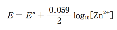 また、硫酸亜鉛は水中では完全に電離し、その活量は濃度に等しいとする。この場合の亜鉛半電池の電極電位 E(単位V)は温度 298 K では次式で表される。