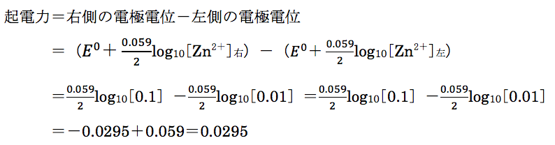 - c1=0.01のとき、この電池の起電力は約+0.059Vである。