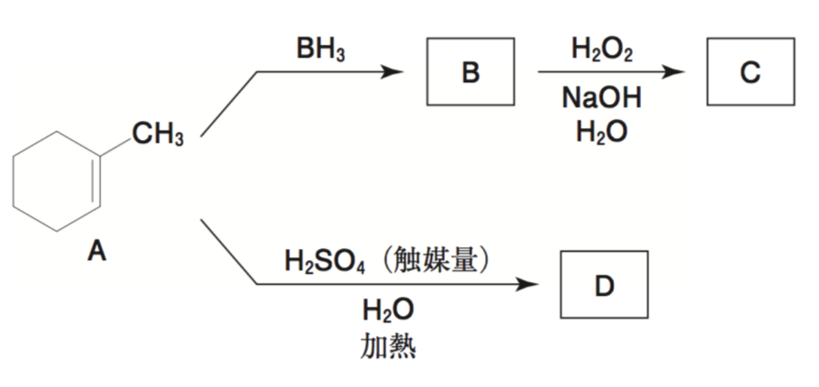 アルケンAから中間体Bが生じる反応は、BH3(ボラン)によるヒドロホウ素化反応であり、syn付加で進行する(なお、この反応は逆マルコフニコフ則に従う)。