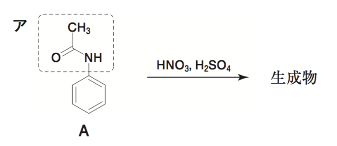 アの部分の共鳴効果によりベンゼン環のオルト位とパラ位に電子を供与するため、オルト−パラ配向性を示す。ただ、アの部分のかさ高さによりオルト位で反応が起こりにくく、オルト置換体が得られにくい。