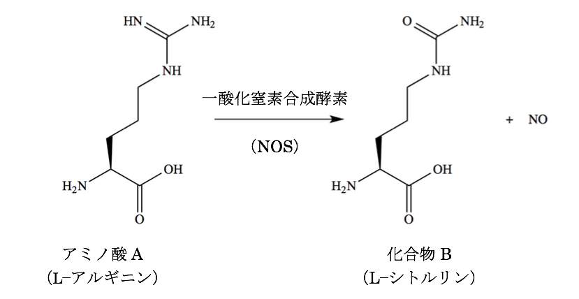 NOは、生体内の一酸化窒素合成酵素(NOS)によってL−アルギニン(アミノ酸A)から生合成される。