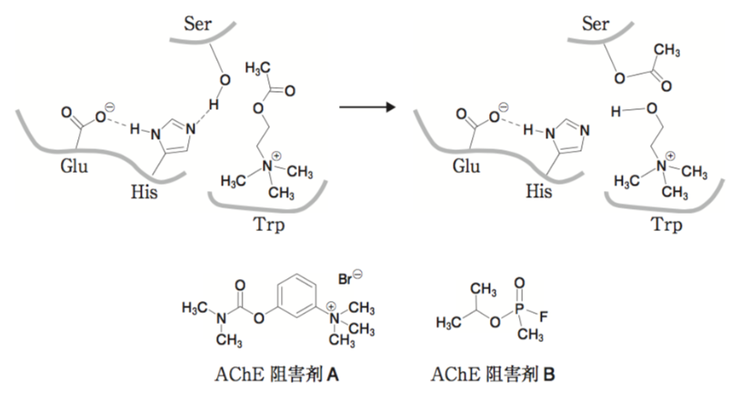 - AChE阻害剤Aはセリンのヒドロキシ基を不可逆的にアミド化する。