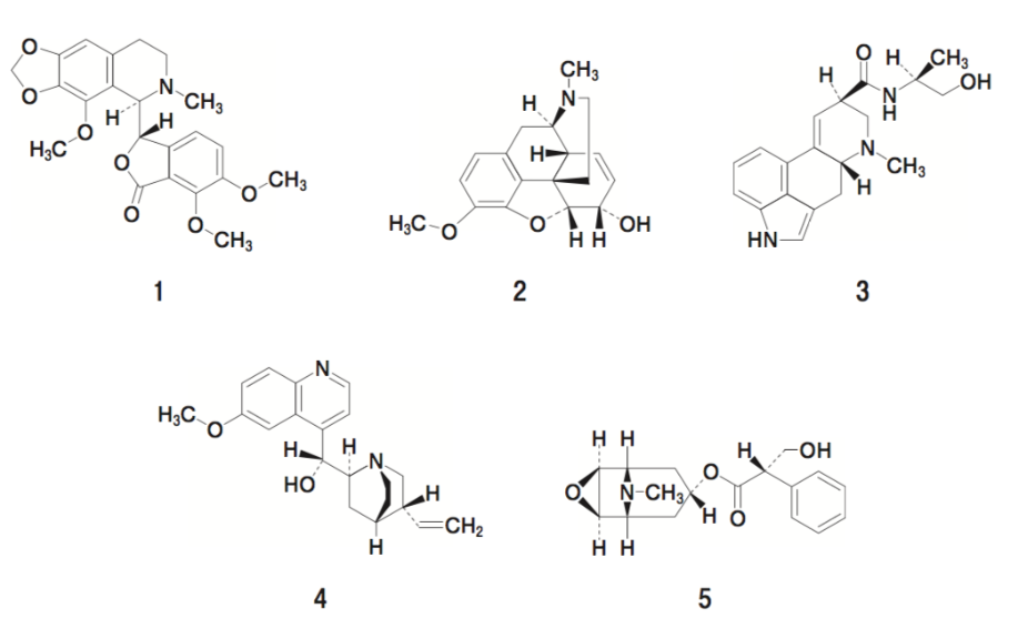 ノスカピンの構造である。ノスカピンはチロシン由来のアルカロイドである。