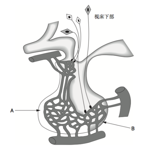 下垂体の部位Aは下垂体前葉、部位Bは下垂体後葉である。下垂体前葉ホルモンは視床下部で産生・分泌される視床下部ホルモンにより刺激を受けると分泌される。それに対して、下垂体後葉ホルモンは視床下部で産生され下垂体後葉で貯蔵・分泌される。
