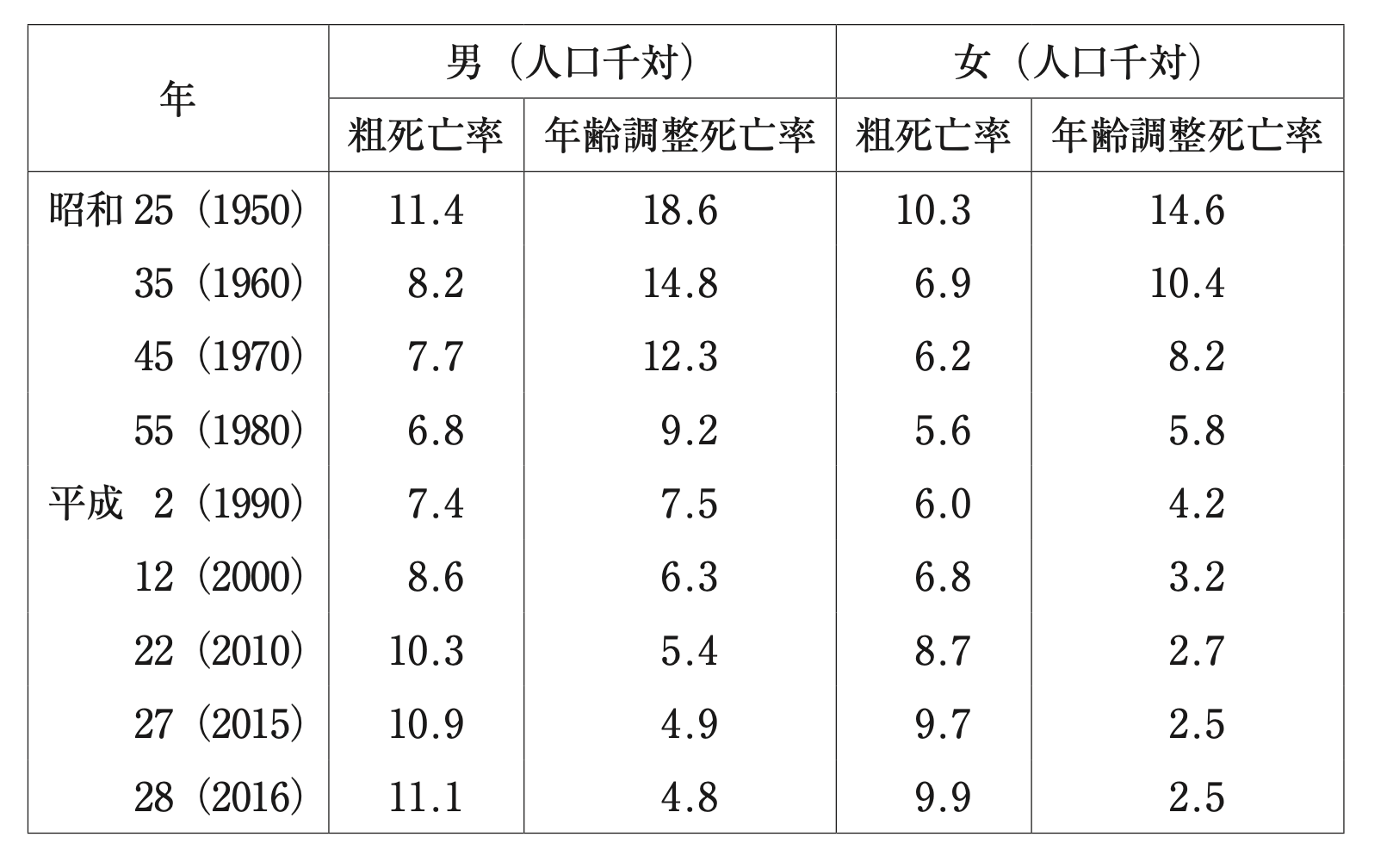 - 2016年における年齢調整死亡率の性差が、粗死亡率の性差より顕著であるのは、その年の年齢別人口構成の性差が顕著であることを反映している。