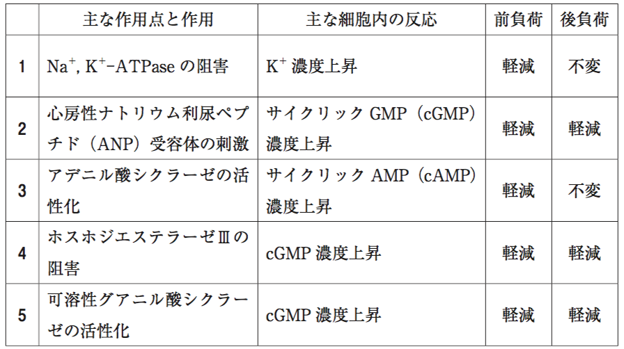 この患者に対して、症状の改善や心臓への負荷を軽減するため、作用機序の異なる2つの薬物が治療薬の候補となった。それぞれの主な作用点と作用、主な細胞内の反応、前負荷及び後負荷に及ぼす影響の組合せのうち、正しいのはどれか。2つ選べ。