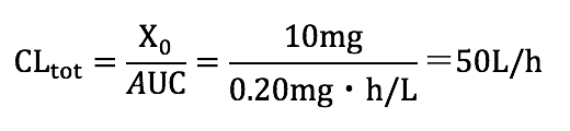 全身クリアランスCLtotは体内未変化体総量X0と血中濃度時間曲線下面積AUCより求めることができる。