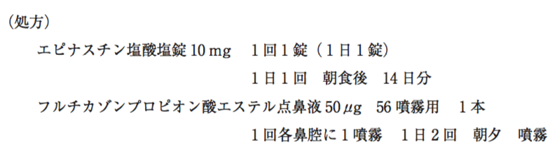 エピナスチン塩酸塩錠およびフェキソフェナジン塩酸塩錠はアレルギー性鼻炎に有効であるため、エピナスチン塩酸塩錠のかわりにフェキソフェナジン塩酸塩錠を使用することも可能である。