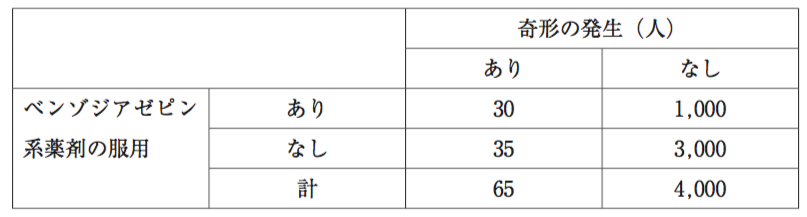薬剤師が検索した論文の1つに下表が掲載されていた。このデータから計算されるベンゾジアゼピン系薬剤の服用による奇形発生のオッズ比として最も近い値はどれか。1つ選べ。