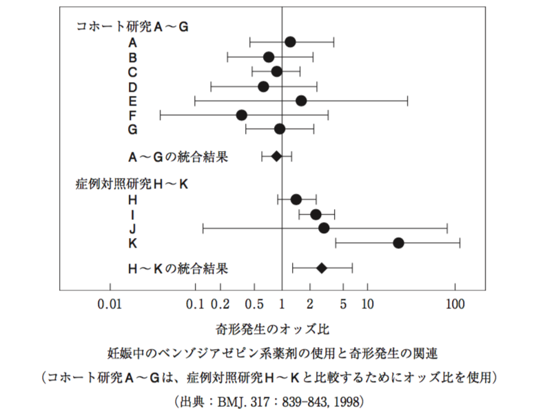 症例対照研究H~Kを統合した結果、 95%信頼区間(横線)が奇形発生のオッズ比1より大きいため、この薬剤を服用すると、奇形発生のリスクが統計学的に有意に高くなるといえる。