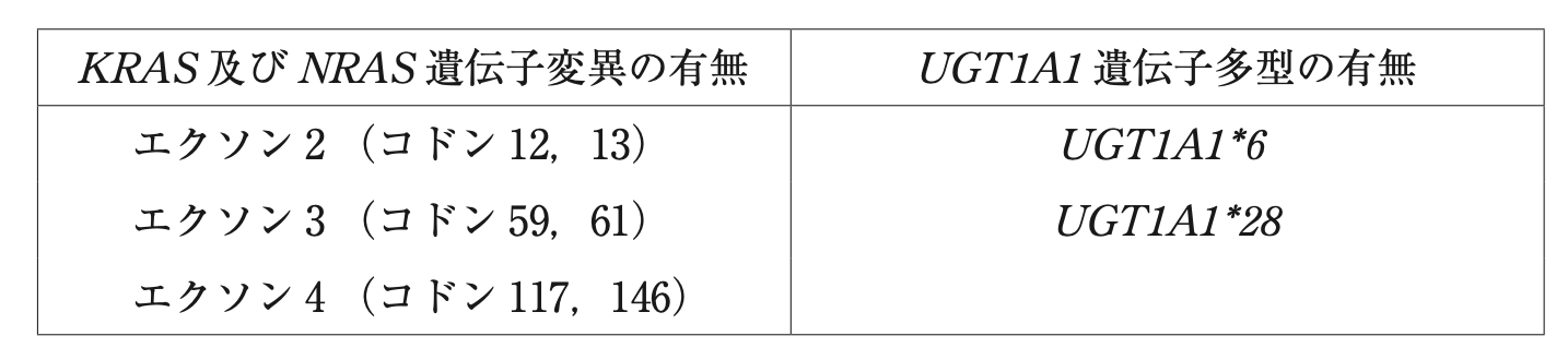その結果、①KRASのエクソン2(コドン12,13)の変異のホモ接合型及び②UGT1A1*28のホモ接合型であった。