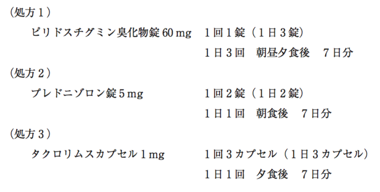 30歳女性。少し前から物が二重に見えることがあり、最近は階段を上るときに下肢のだるさを感じるようになった。また、夜は歯磨き程度でも腕が疲れるようになったため受診した。早期の重症筋無力症と診断され、以下の薬剤が処方された。